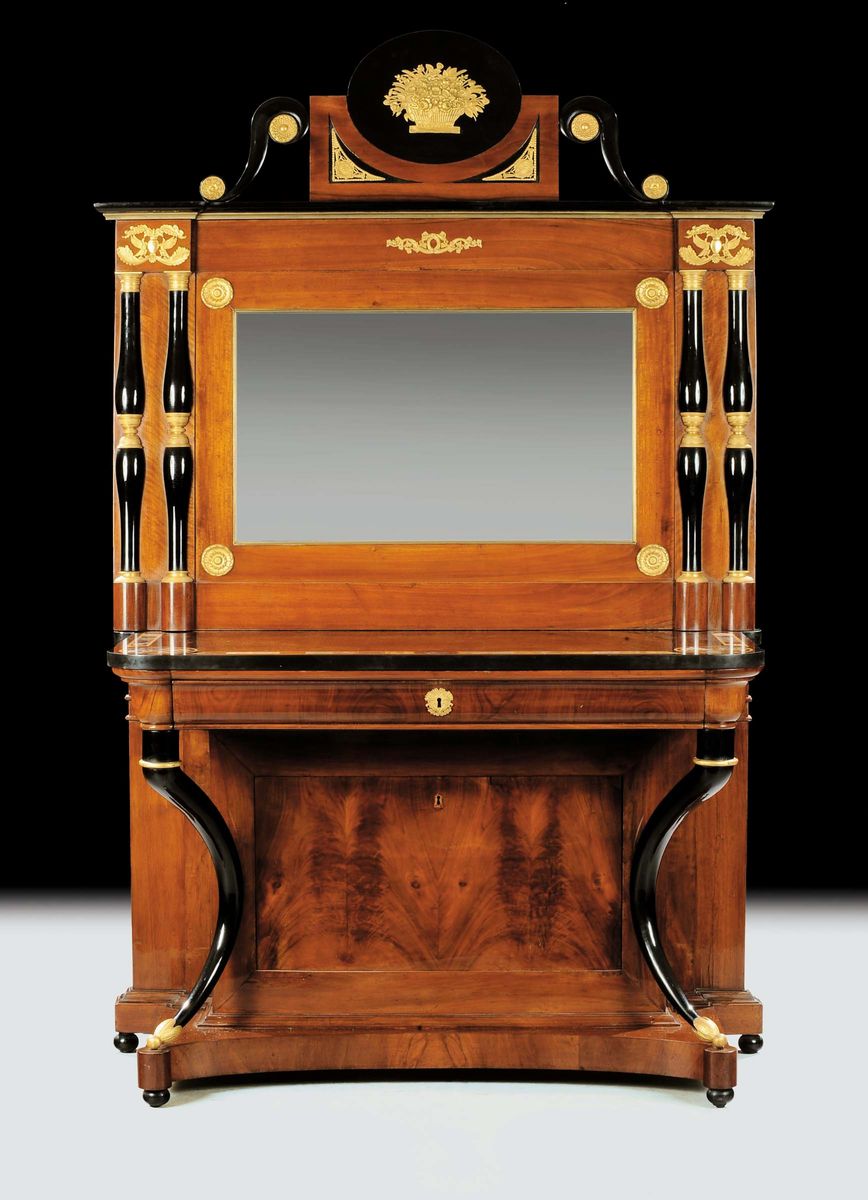 montanti a corno in legno ebanizzato e dorato, calatoia sotto il piano che cela ripiani, un casseto sulla fascia modanata, piano in marmo nero intarsiato in marmi policromi, specchiera con coppie di colonne strozzate sui montanti e applicazioni di bronzi dorati, cimasa con placca centrale in bronzo dorato raffigurante un cesto di fiori, cm 143x62x95, altezza specchiera cm 135