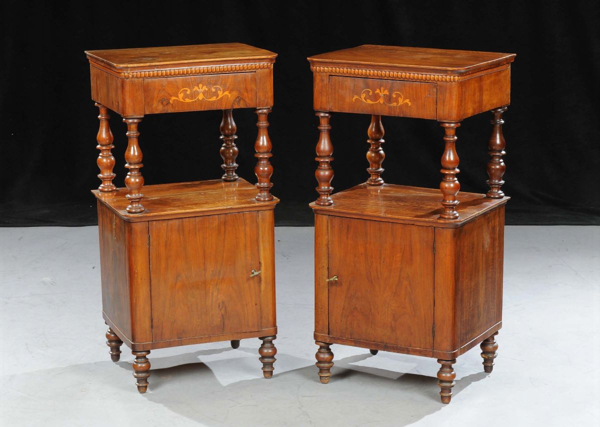 Coppia di comodini Carlo X in noce intarsiato, XIX secolo