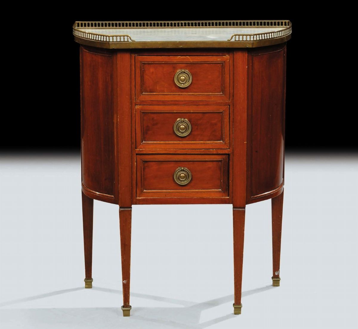 piano in marmo bianco incassato, fronte a tre cassetti, gambe troncopiramidali, ringhierina in bronzo dorato, cm 61x32x76
