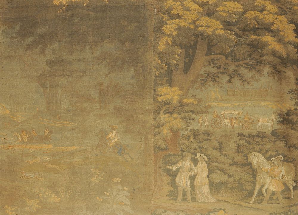 raffiguranti scena di caccia e paesaggio con carrozza e cavalieri