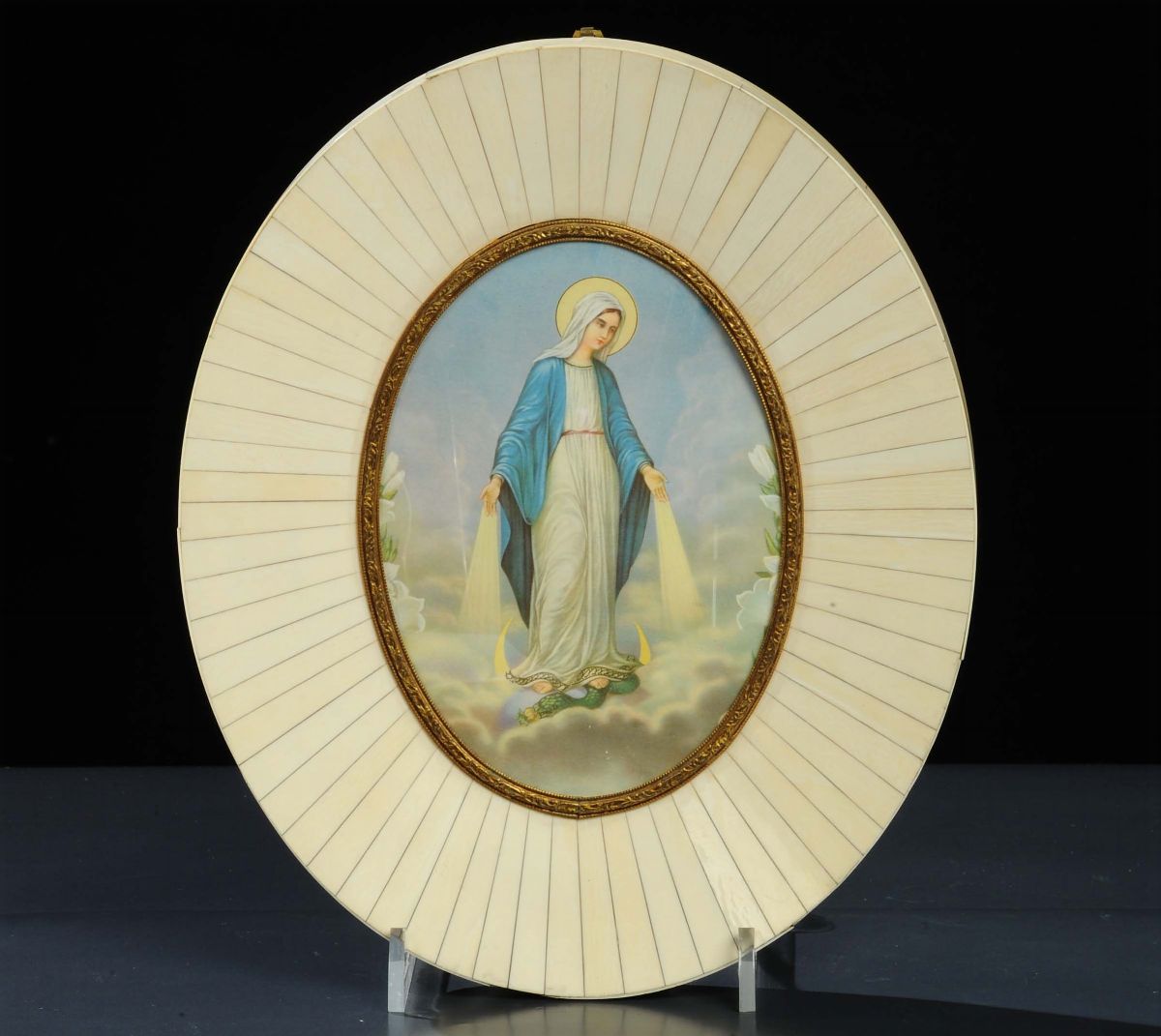 Cromolito raffigurante Madonna entro cornice in avorio, XX secolo