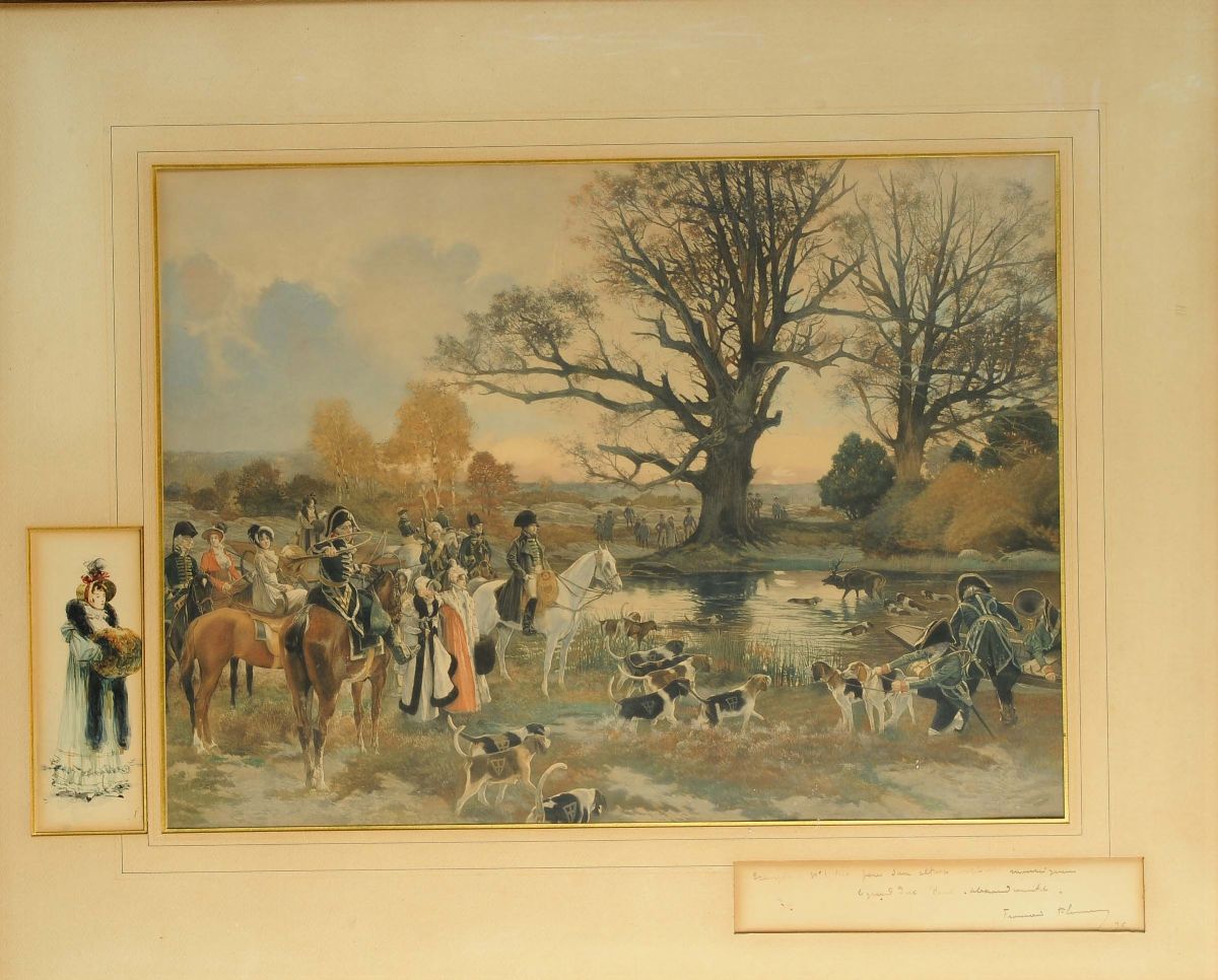 Due stampe raffiguranti scena di caccia e scena di genere