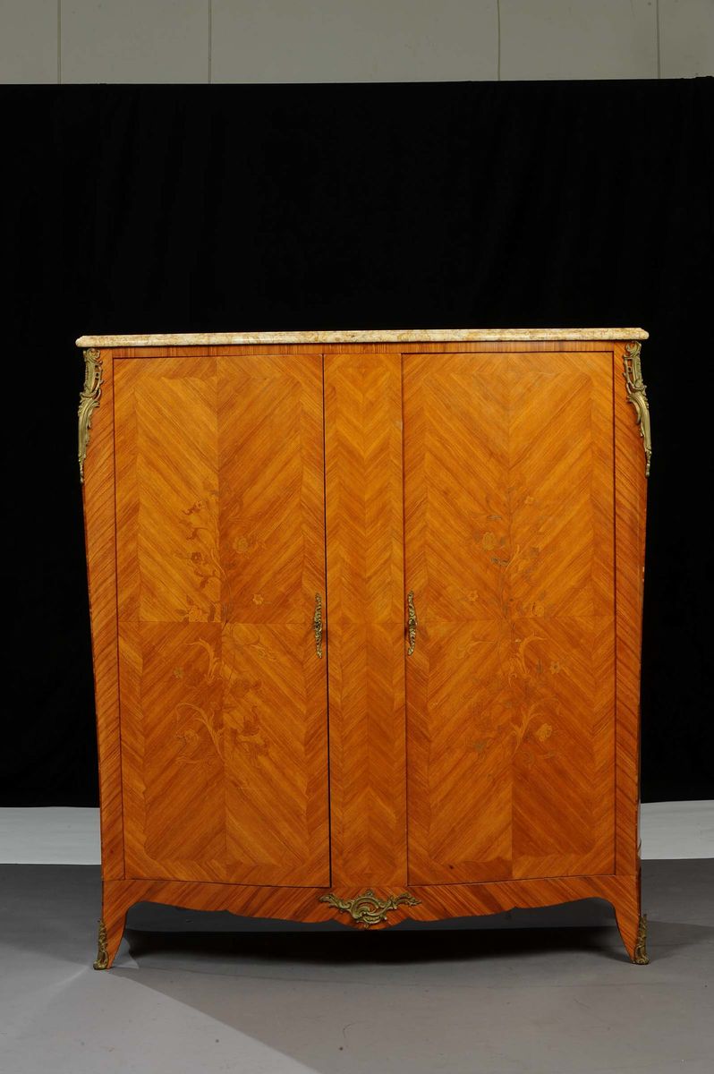 due ante a vetri, montanti con colonne scanalate, piedi torniti, applicazione di bronzi dorati, cm 130x55x225