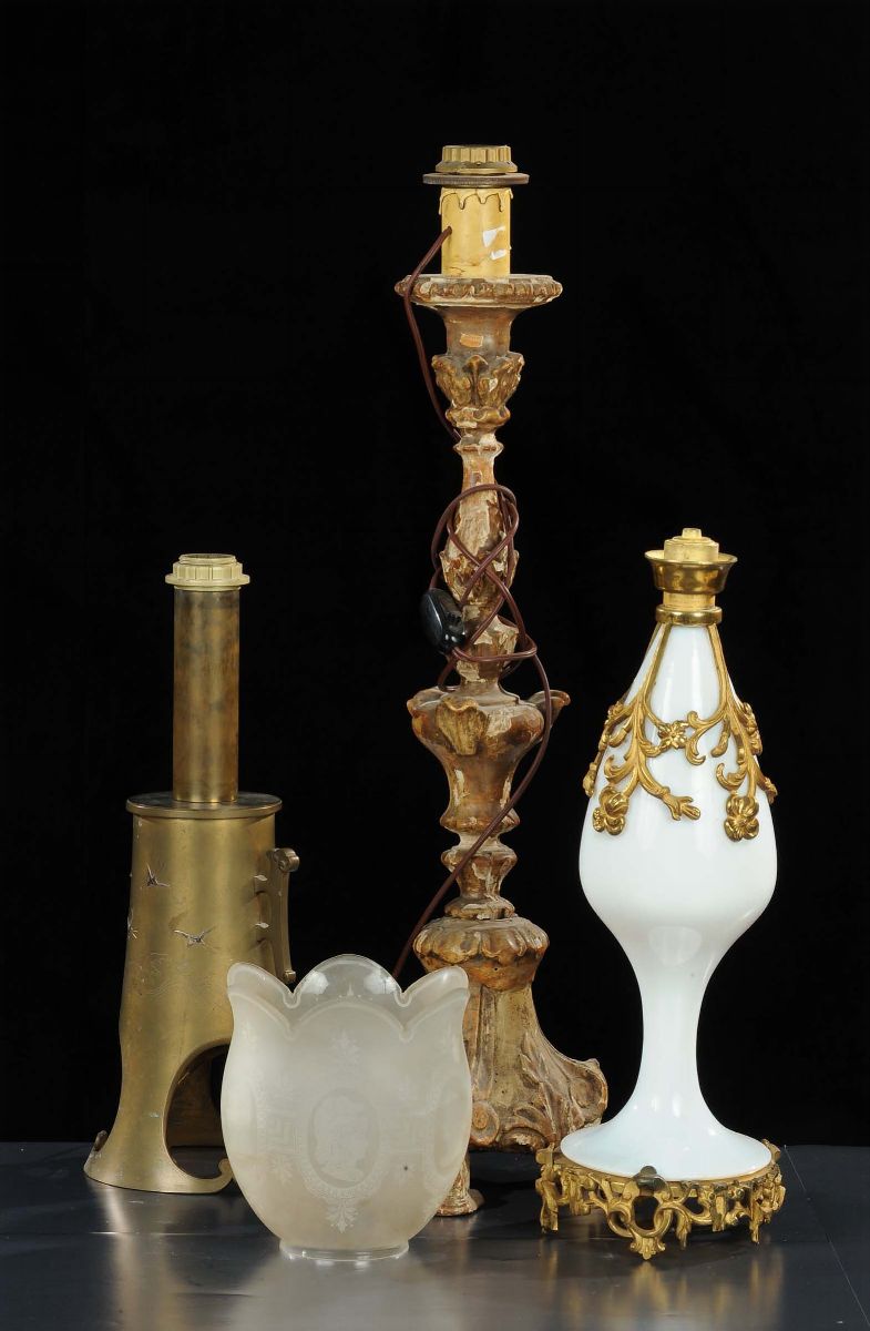 Lotto di due lumi da tavolo in vetro e bronzo