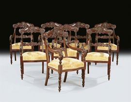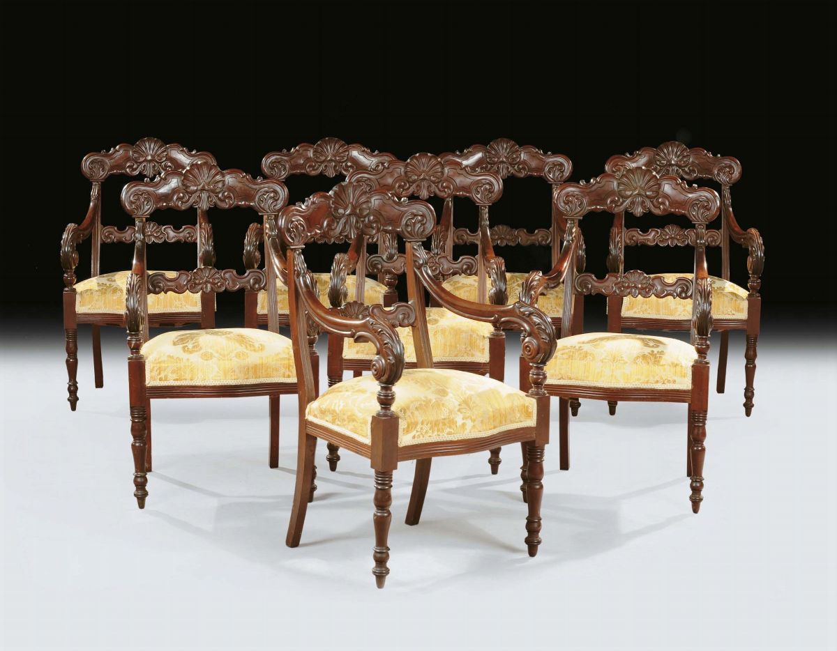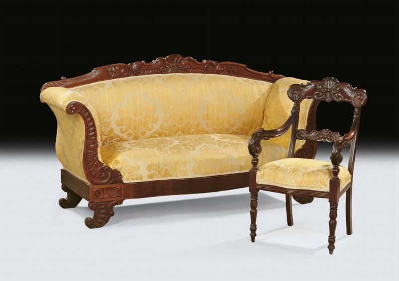 in mogano intagliato, gamba anteriore tornita, posteriore a sciabola, braccioli a ricciolo, schienale con conchiglia al centro, seduta rivestita in damascato giallo