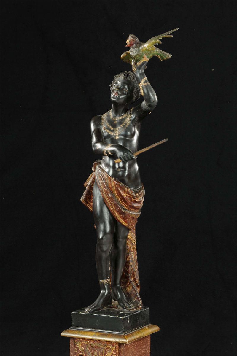 Scultura in legno raffigurante moretto con volatile, XIX secolo