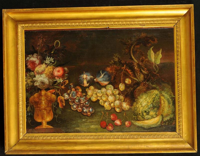 Scuola Italiana del XIX secolo Natura morta con fiori e frutta