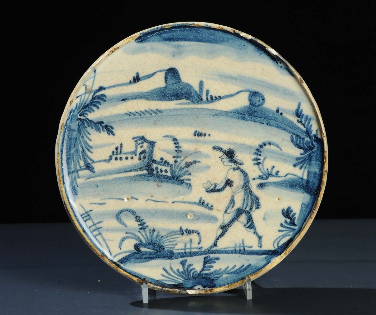 decoro in monocromia turchina con figura entro paesaggio, diametro cm 28,5