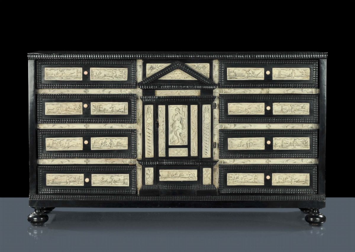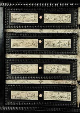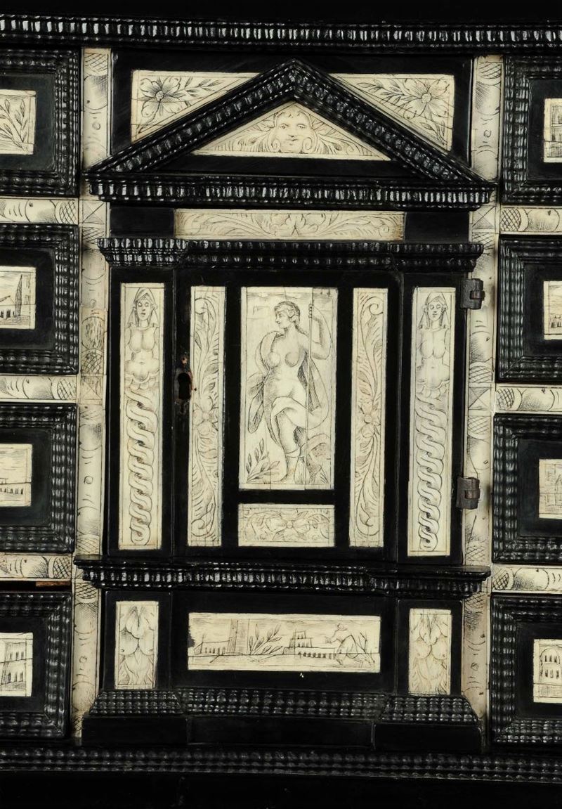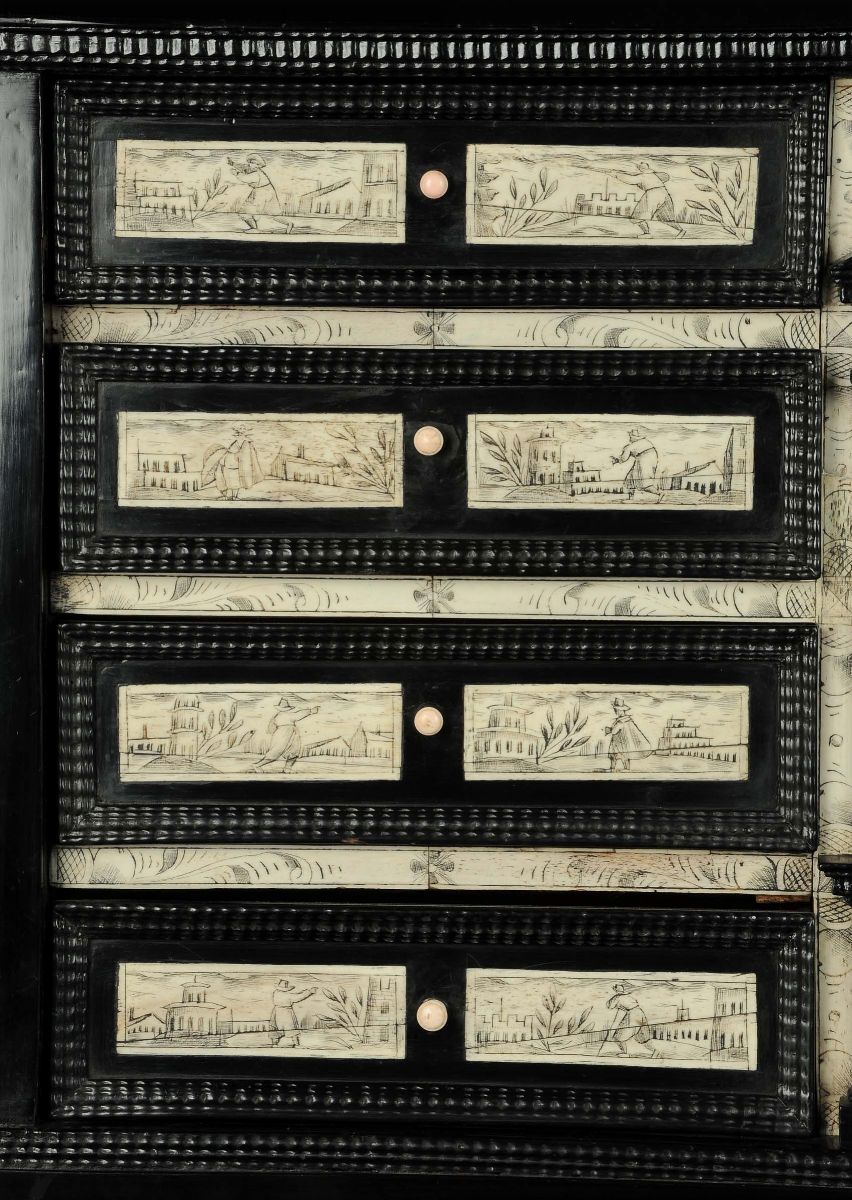 parte centrale a tempietto; il decoro, eseguito su lastrine di avorio graffito, raffigura vedute con personaggi sui cassetti e una figura femminile nell'anta centrale, piedi a cipolla, cm 39x32x52