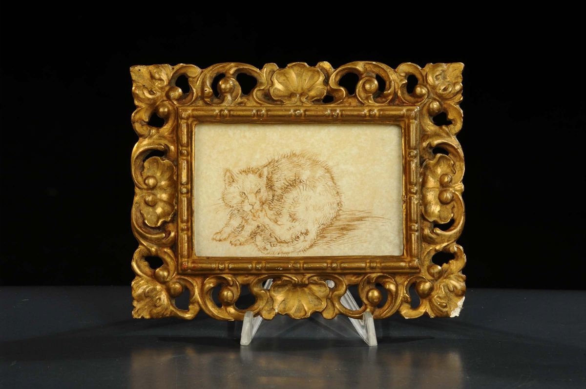 china su pergamena, cm 8x13, entro cornice a pastiglia dorata