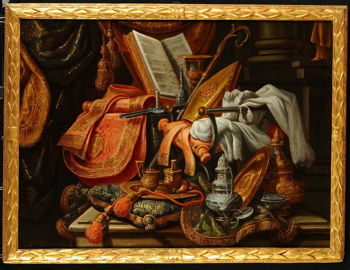 olio su tela, cm 97x134.La coerenza tematica dei soggetti raffigurati sono relativi ai paramenti liturgici di un vescovo, come la mitria e il bastone pastorale con ricciolo terminale. Presenti anche incensiere, calice, messale e altri paramenti. Sulla veste dipinto lo stemma del cardinale Chigi