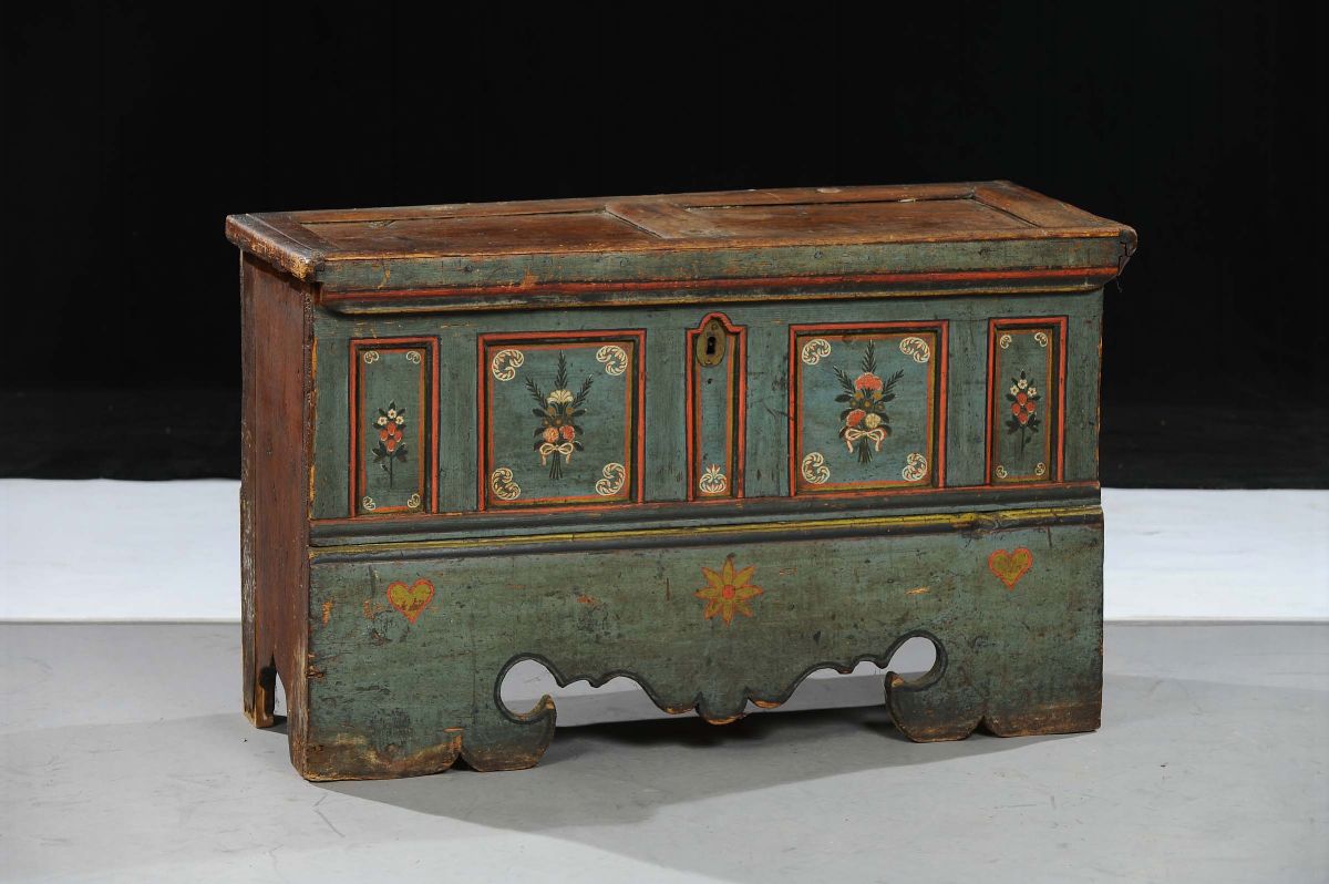 Cassapanca in legno con fronte dipinto in policromia, Arte tirolese fine XIX secolo