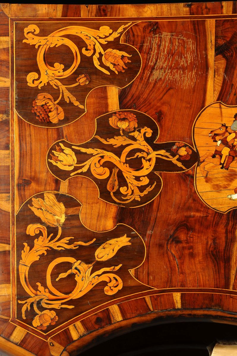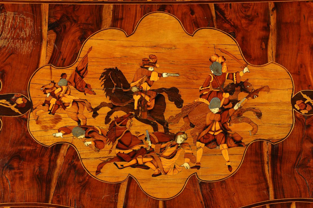 fronte mosso e montanti angolari a 45¡. I motivi decorativi intarsiati e ombreggiati a fuoco sono di gusto fiammingo, influenzati dalle maestranze nordiche attive nei territori della Serenissima Repubblica di Venezia. Sul piano, intarsiato al centro un medaglione sagomato con scena di battaglia tra cavalieri.