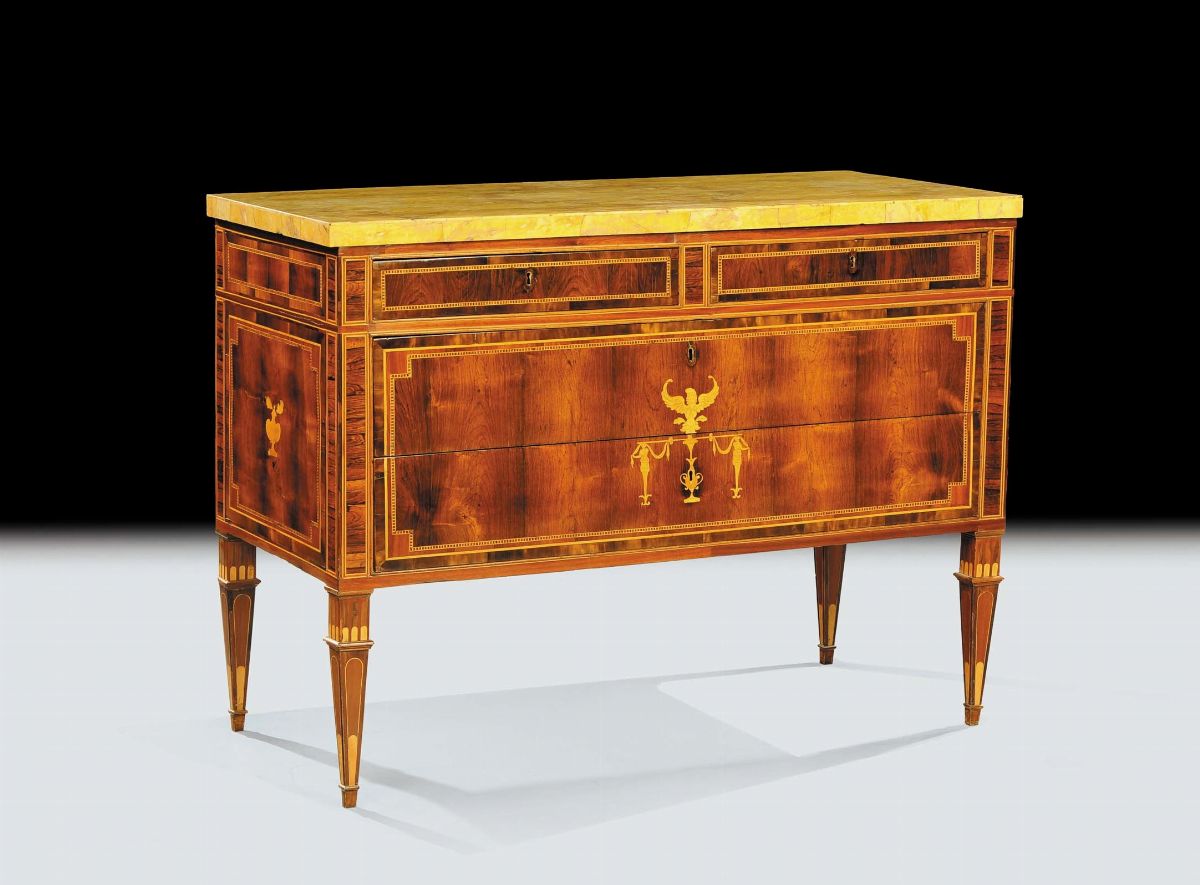 Cassettone Luigi XVI lastronato in palissandro ed intarsiato in legno di frutto, XVIII secolo