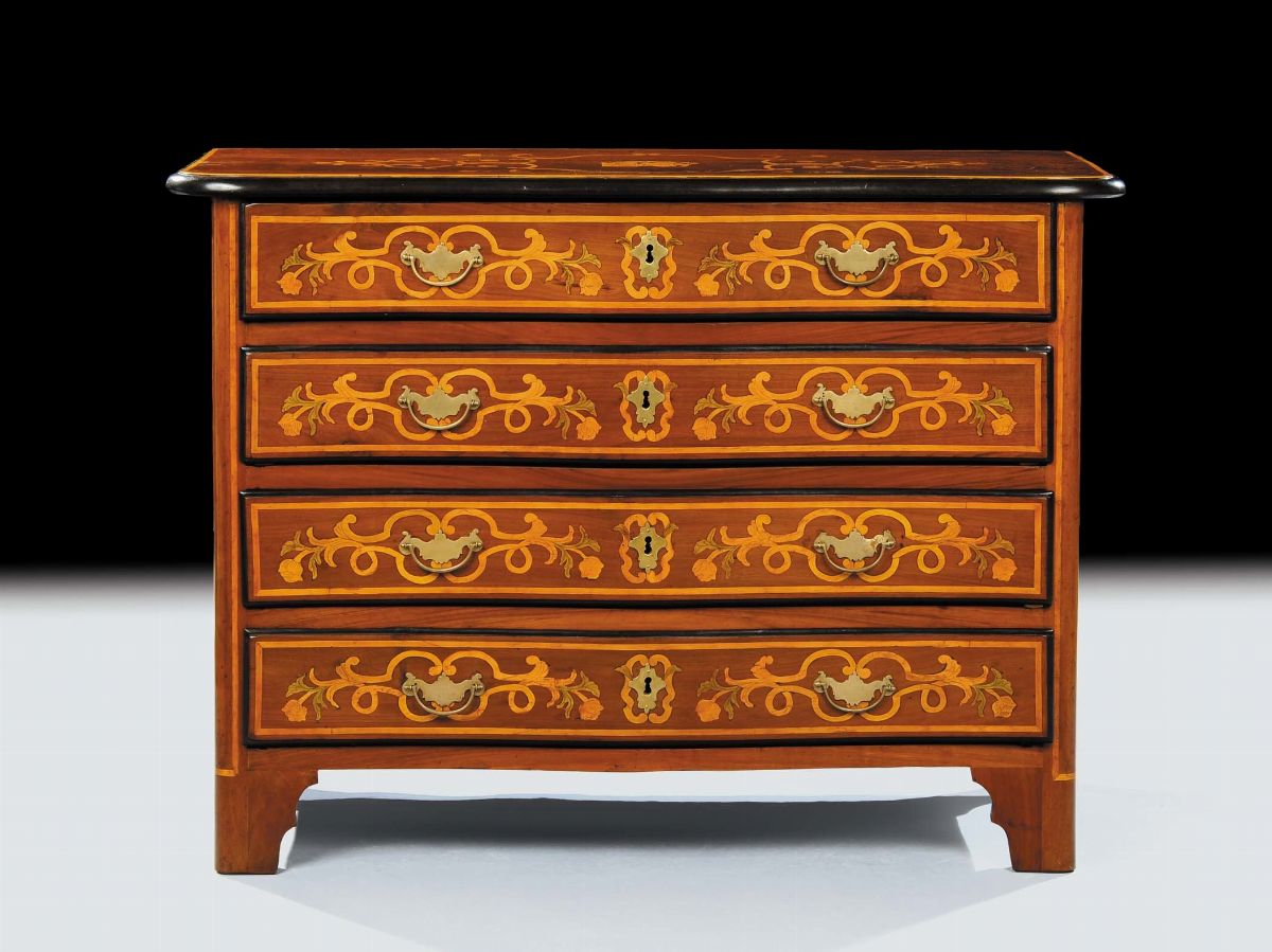 Com˜ Luigi XIV a quattro cassetti in noce intarsiato, Piemonte XVIII secolo