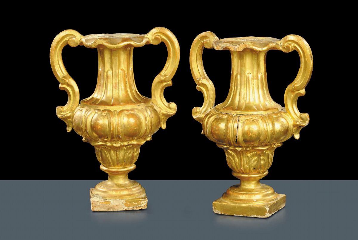 Coppia di anfore in legno intagliato e dorato, XIX secolo