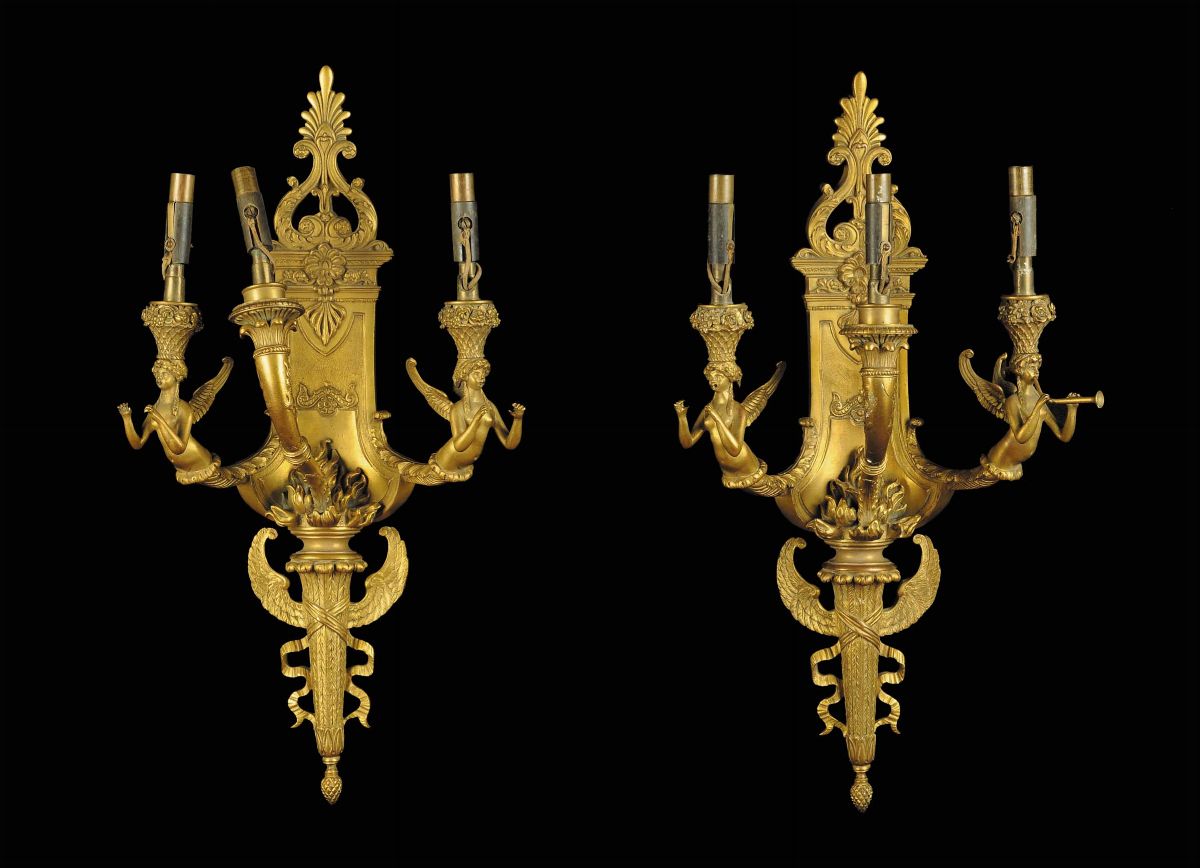 Coppia di appliques in bronzo dorato a tre luci, Francia XIX secolo