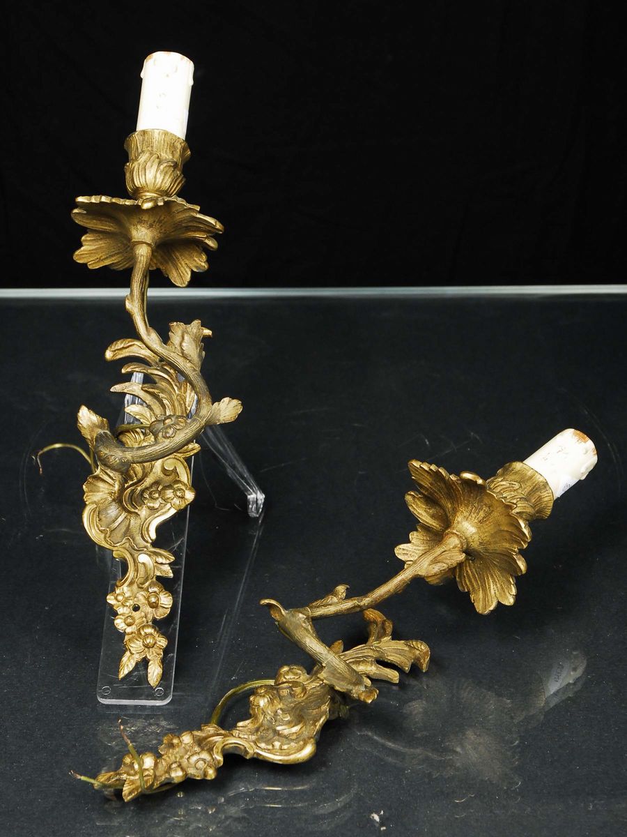 Coppia di appliques in bronzo dorato a una luce, Francia epoca Luigi XV