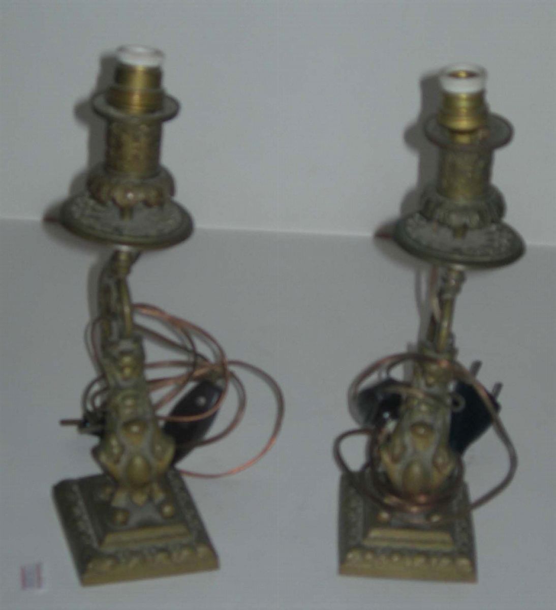 Coppia di candelieri ad una luce in metallo dorato, XIX secolo
