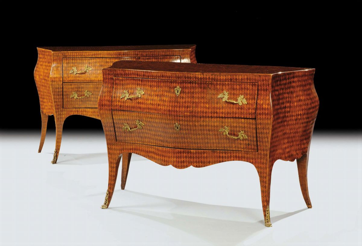 Coppia di cassettoni in stile Luigi XV lastronati a marqueterie, fine XIX secolo