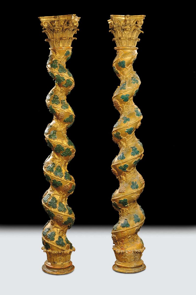Coppia di colonne a torciglione in legno intagliato e laccato, XVII secolo