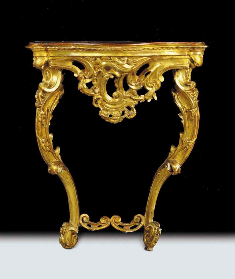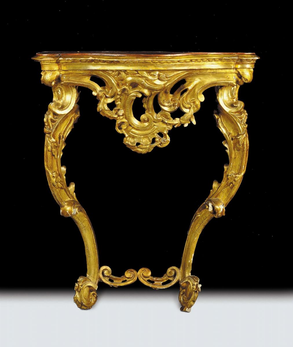 Coppia di console Luigi XV in legno intagliato e dorato, fine XVIII secolo