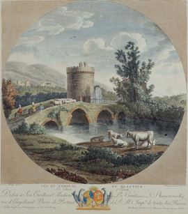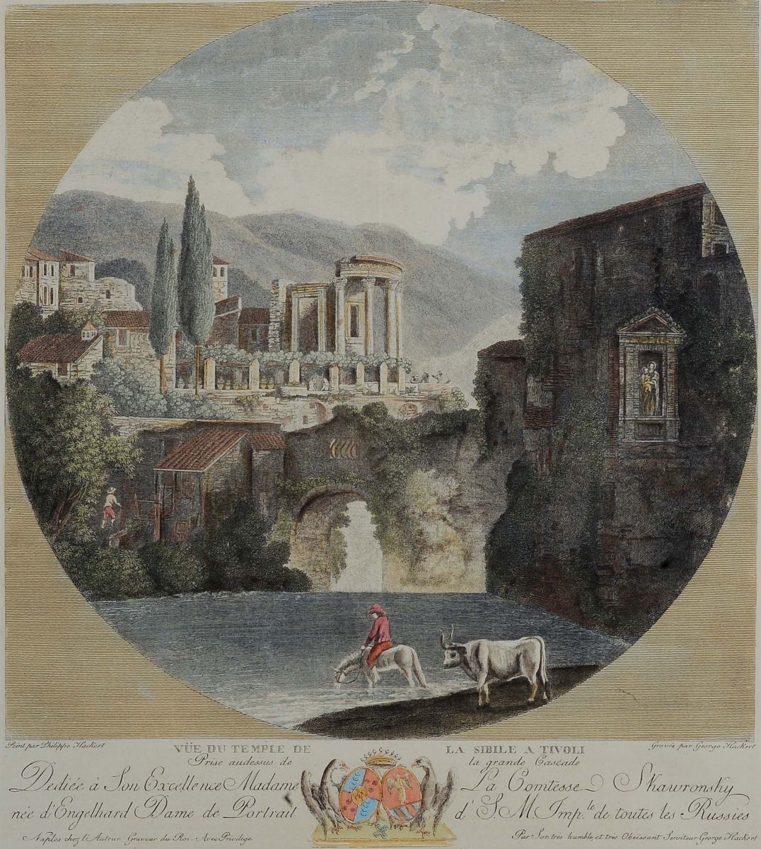 Coppia di incisioni acquarellate raffiguranti paesaggi, XIX secolo