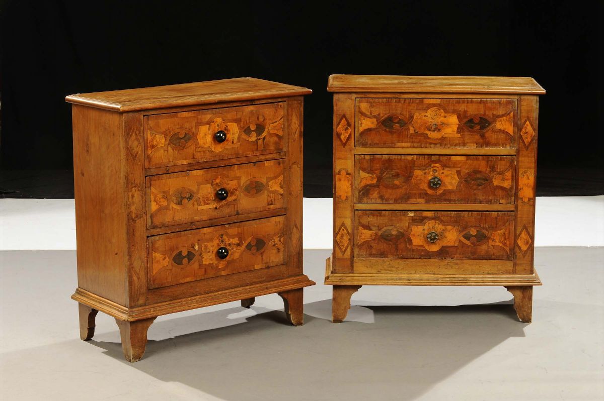 Coppia di piccoli cassettoni lastronati in noce, fine XVIII secolo