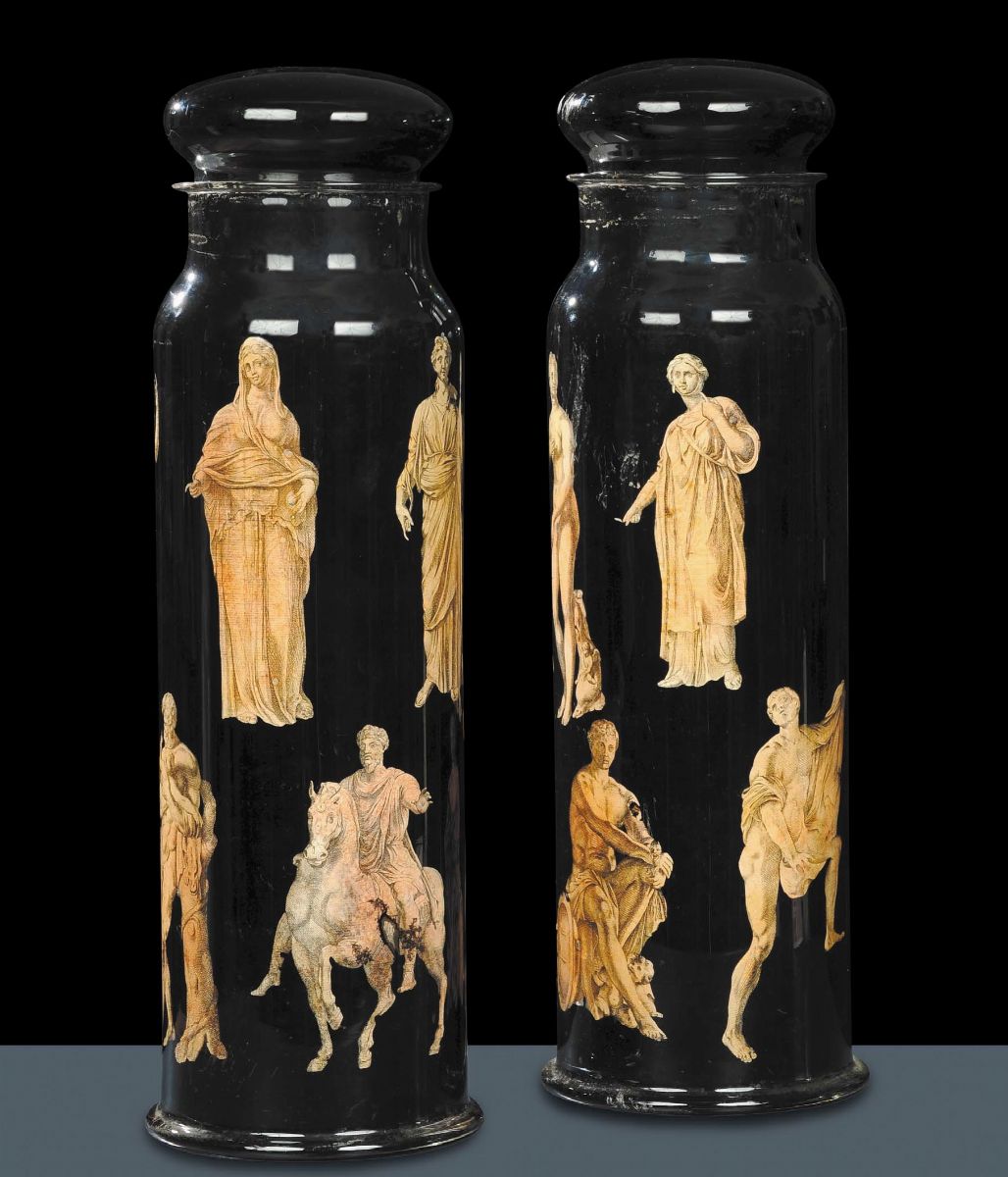 Coppia di vasi cilindrici in vetro con coperchio decorati ad arte povera con soggetti di sculture dellÕantichitˆ classica, [..]