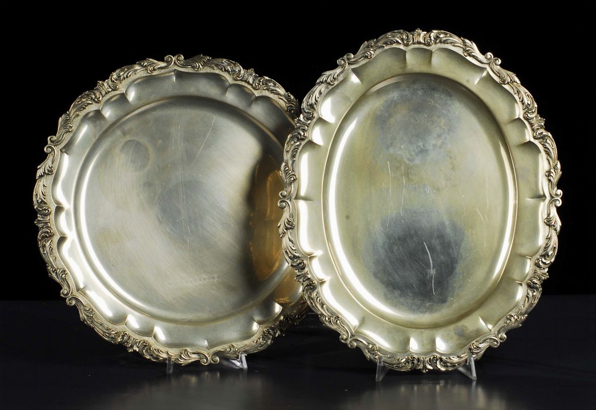Due piatti da portata in argento con bordo lavorato, gr. 2200 circa