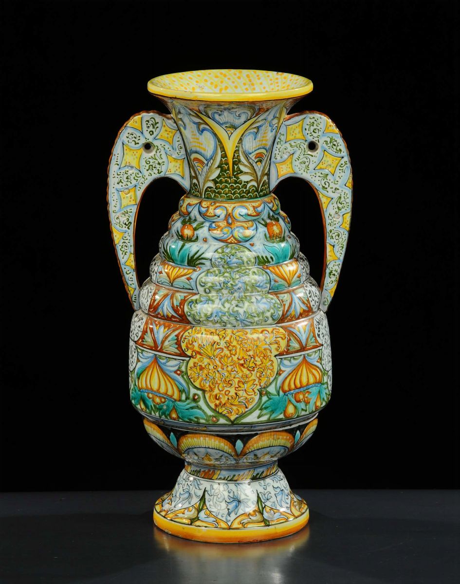 vaso in terracotta maiolicata con decoro floreale in smalti policromi, altezza cm 39