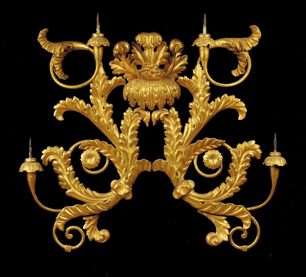 Grande portaceri in legno scolpito dorato a quattro fiamme, XVIII-XIX secolo