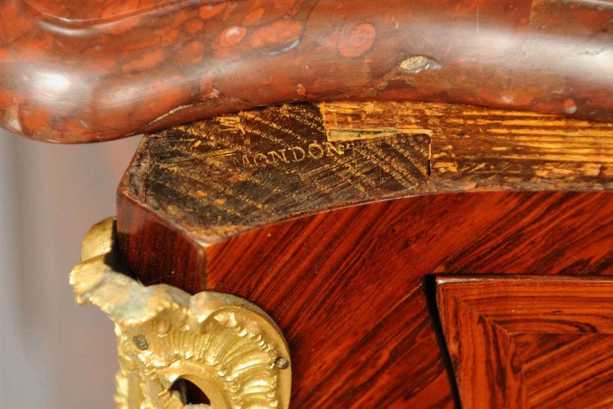 due cassetti mossi sul fronte, piano in marmo rosso, applicazioni di bronzi dorati, cm 139x63x84Franois Mondon nacque nel 1694 e mor“ nel 1770, fu ricevuto come maestro artigiano verso il 1730 o 1735. Ha collaborato varie volte con il creatore della mobilia della corona, Gilles Joubert; lo dimostrano numerose parti trasportate da Joubert che sono state timbrate da Mondon