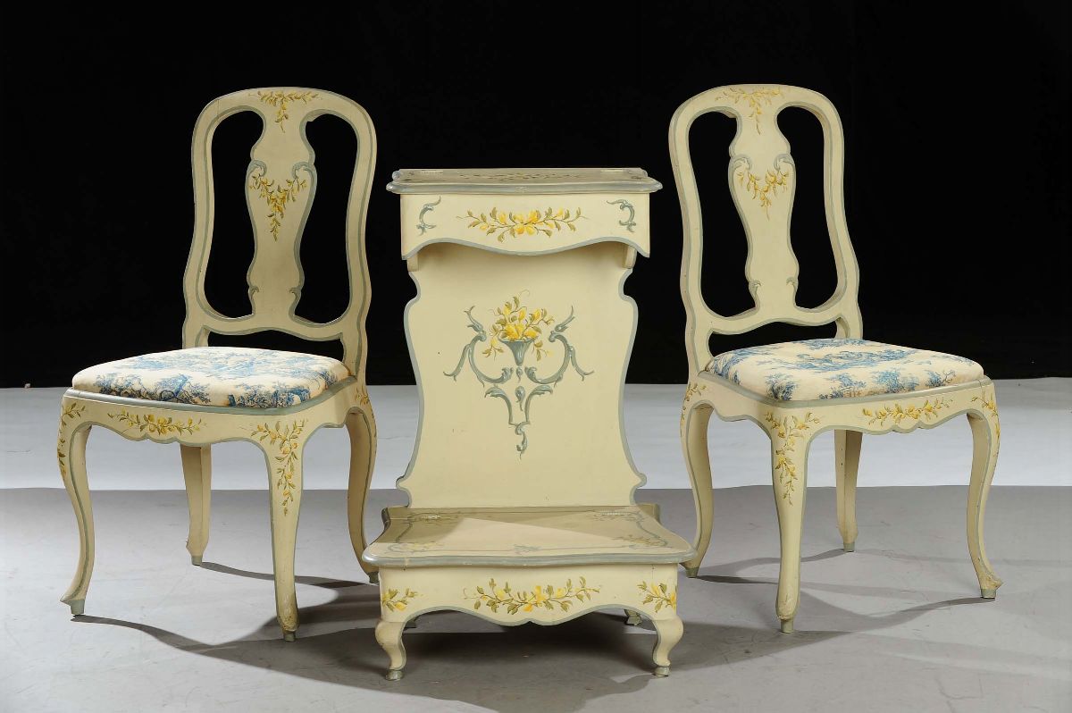 Inginocchiatoio e due sedie laccati, XX secolo