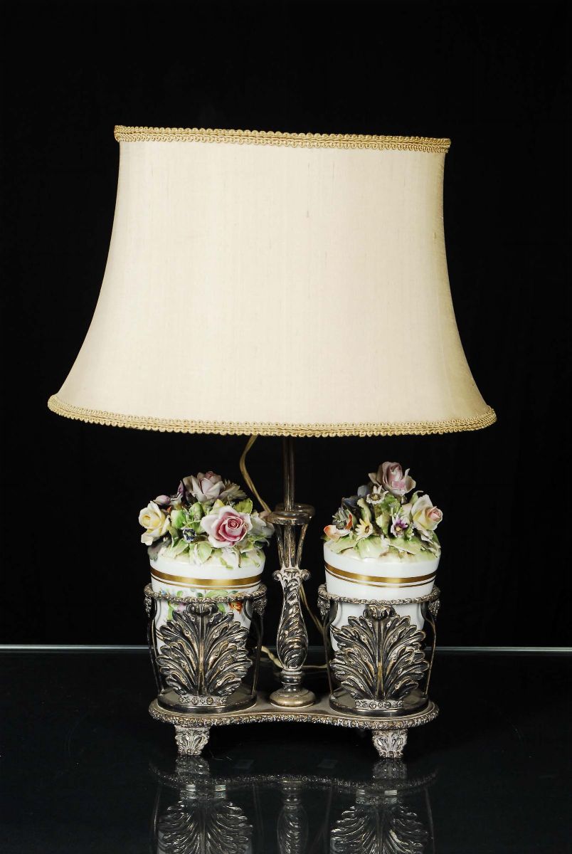 costituita da un portampolle in metallo argentato e due vasi con fiori in rilievo in porcellana policroma, cm 20x10x40