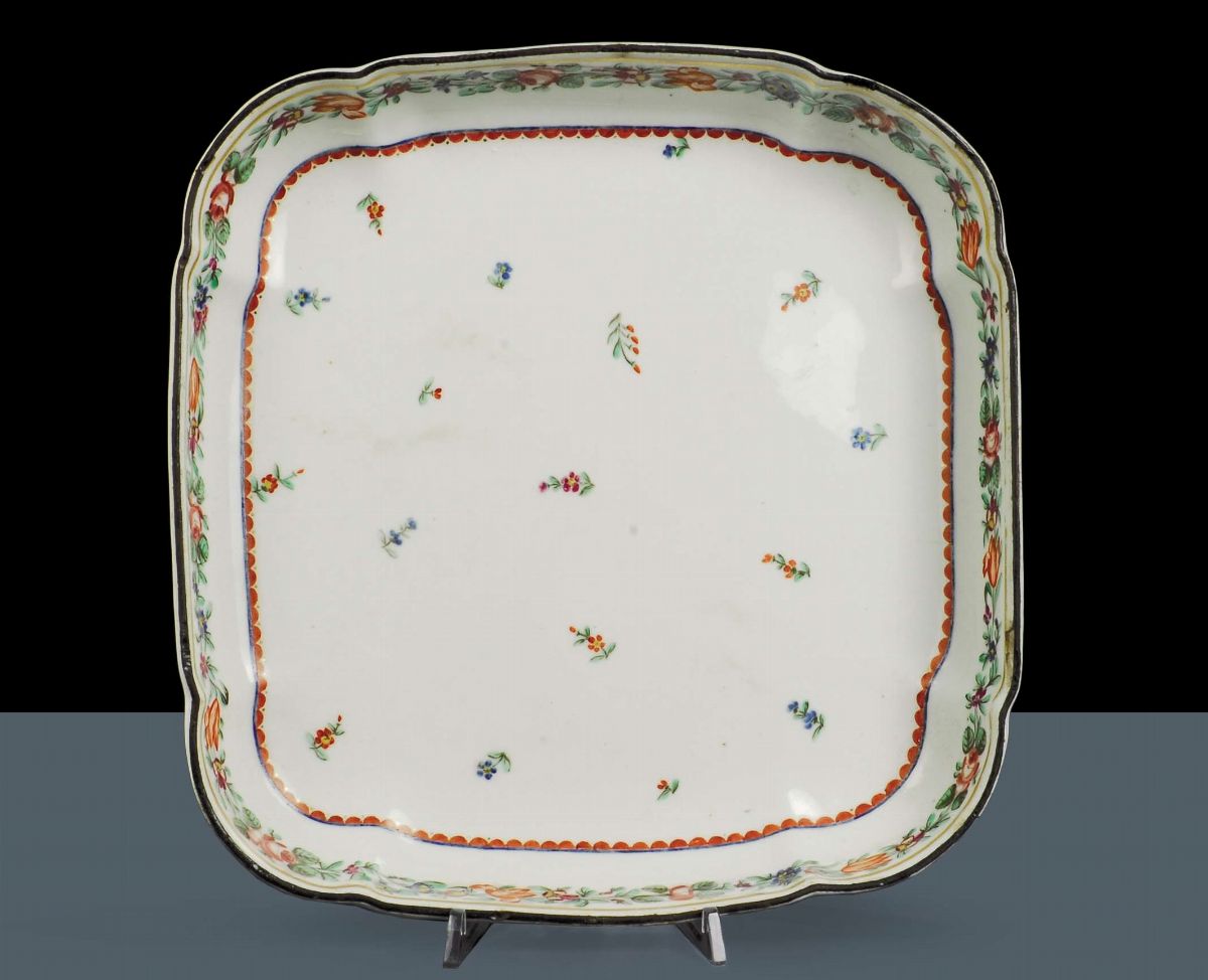 Piatto quadrato in porcellana bianca con decoro policromo a fiori, XIX secolo