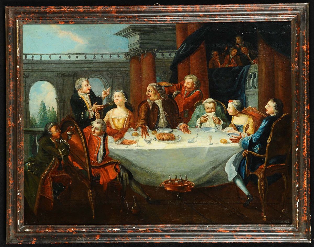 Pietro Longhi (1702-1785), ambito di Banchetto con personaggiScena con personaggi e architetture