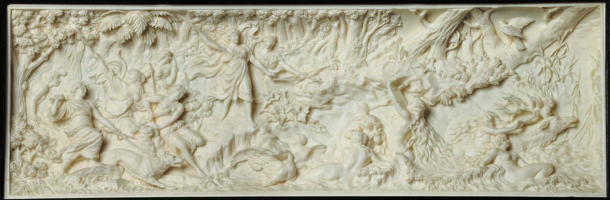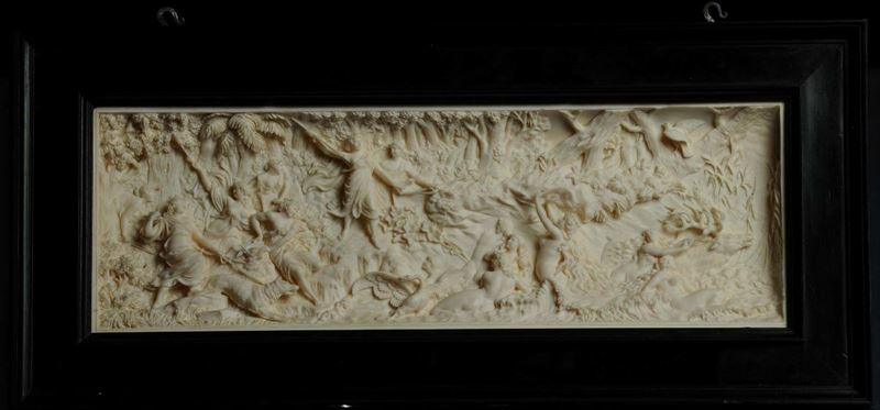 Placca in avorio finemente scolpito raffigurante scena mitologica, XIX secolo