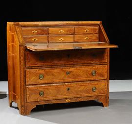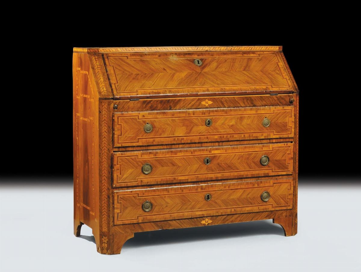 tre cassetti alla base, calatoia che cela cassettini, filettature in legni dolci, angoli scantonati, cm 120x56x109