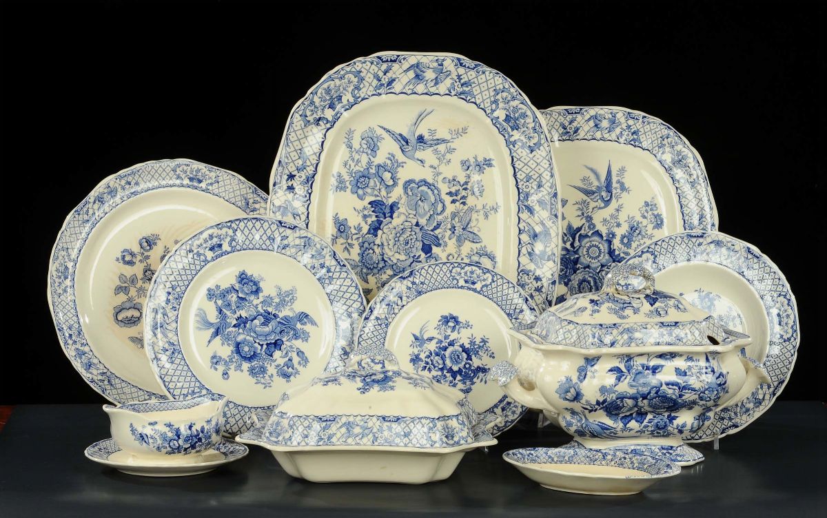 composto da 22 piani, 9 fondi, 12 frutta, 3 fondi, 2 piatti tondi e 3 ovali di servizio, 1 insalatiera, zuppierina, piatto da burro 1 salsiera e zuppiera grande
