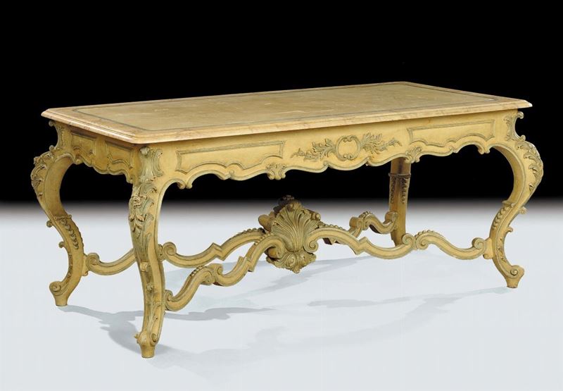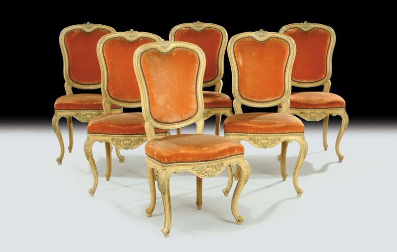 Tavolo e sei sedie in legno intagliato e laccato, XIX secolo