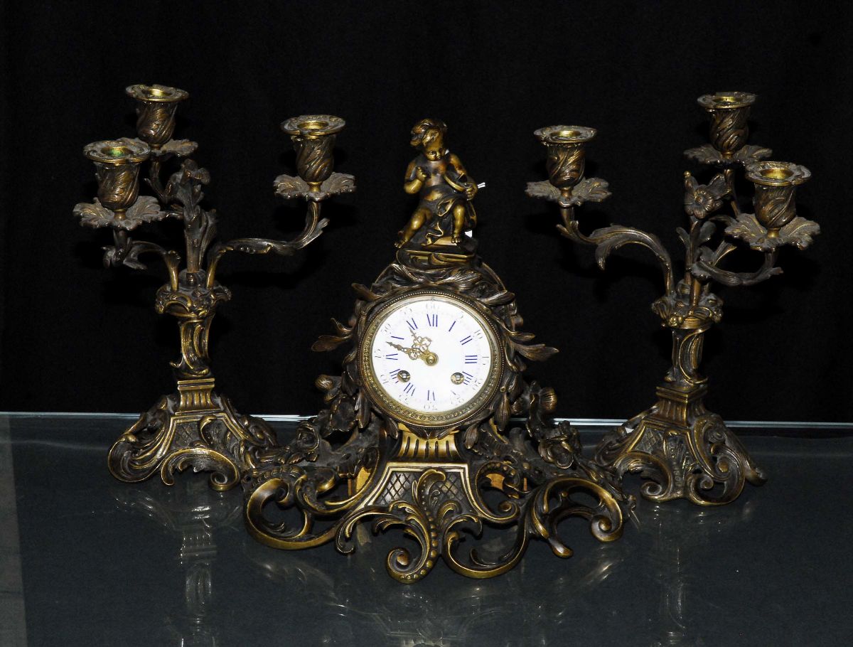 Trittico composto da orologio e due candelieri in bronzo