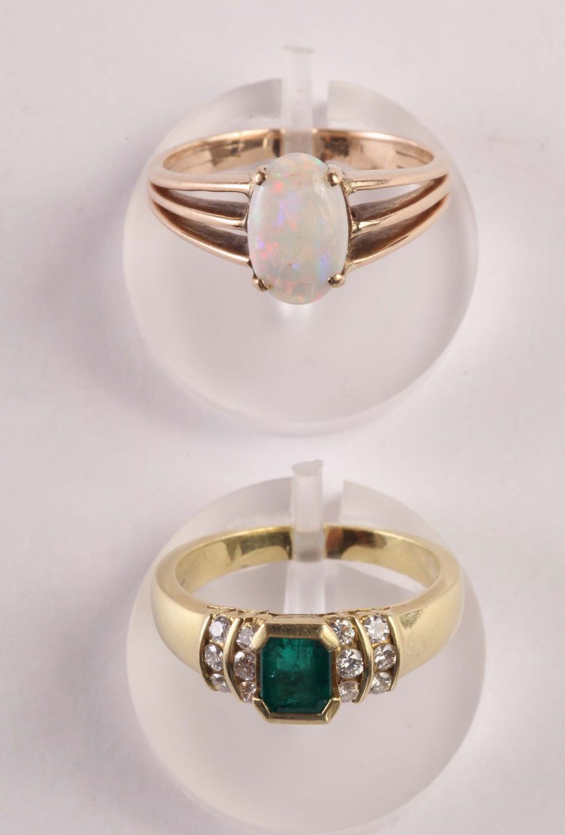 Lotto composto da un anello con smeraldo e diamanti, oro 18Kt, ed un anello con opale