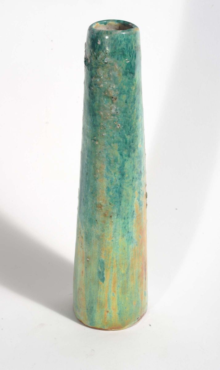 Vaso troncoconico smaltato nei toni del verde e giallo a decoro astratto. Sul fondo la sigla U entro il disegno di un vaso. Altezza cm 30