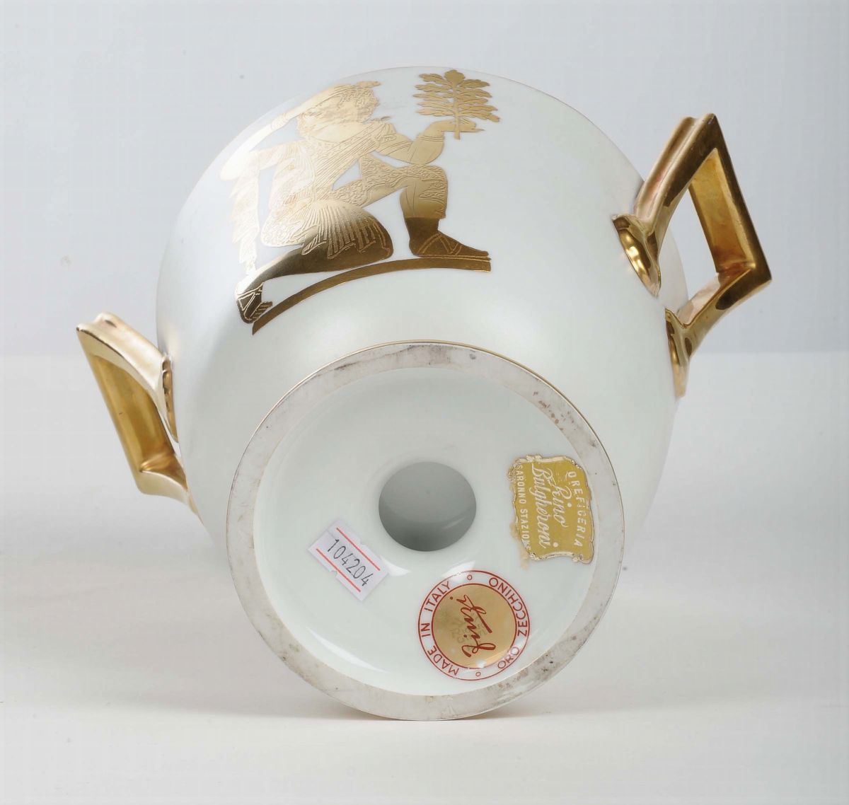 Porcellana decorata in oro. Sotto la base Finzi Made in Italy, oro zecchino. Altezza cm 20