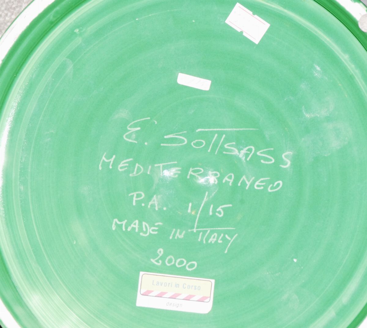 ceramica smaltata verde a strisce oro trasversali su base circolare. Sul fondo firma, titolo, tiratura. Altezza cm 23