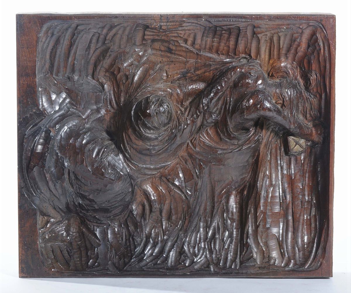 formella in legno scolpita a bassorilievo con figure. cm 52,3x62,5
