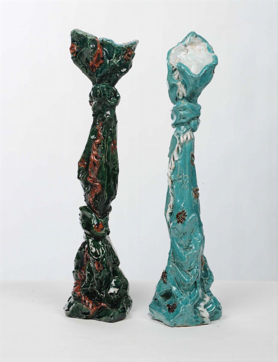 erracotta policroma smaltata, 1949. Bibl. Leoncillo, Claudio Spadoni, L’attico Esse arte, pag 299 tav. 9. Altezza cm 46,5 e 48 (lievi restauri)