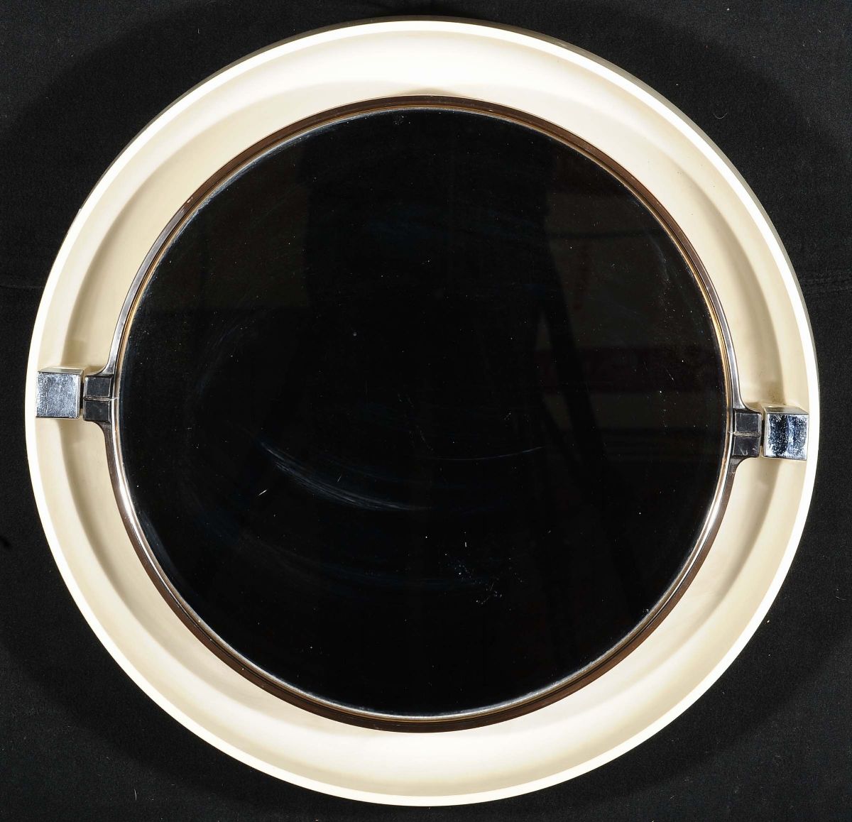 Coppia di specchi in materiale plastico bianco con retroilluminazione. Contrassegnati Allibert model Wand - Leucht Spiegel A41. Diametro cm 59.1960 circa