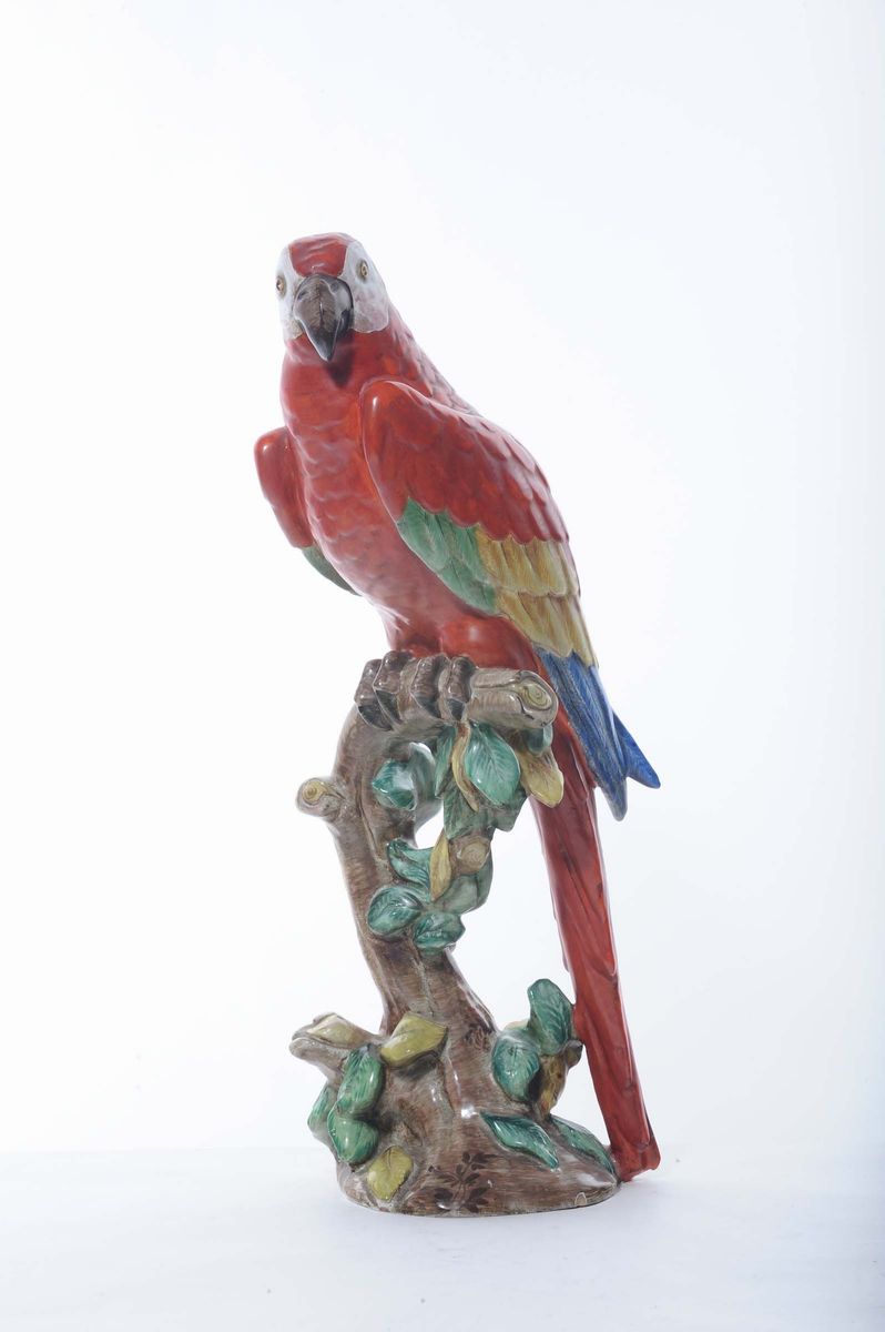 Scultura in ceramica policroma raffigurante pappagallo appollaiato su un ramo fiorito. Firma sul fondo. Lievi difetti. Altezza cm 55